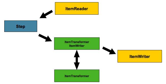 The basic configuration above is fairly robust. However, there are many cases where the item needs to be transformed before writing. In 1.x this can be achieved using the composite pattern: