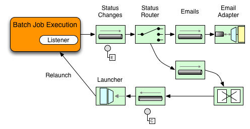 The following image illustrates the typical Spring Integration message flow in order to start a Batch job. The EIP (Enterprise IntegrationPatterns) website provides a full overview of messaging icons and their descriptions.