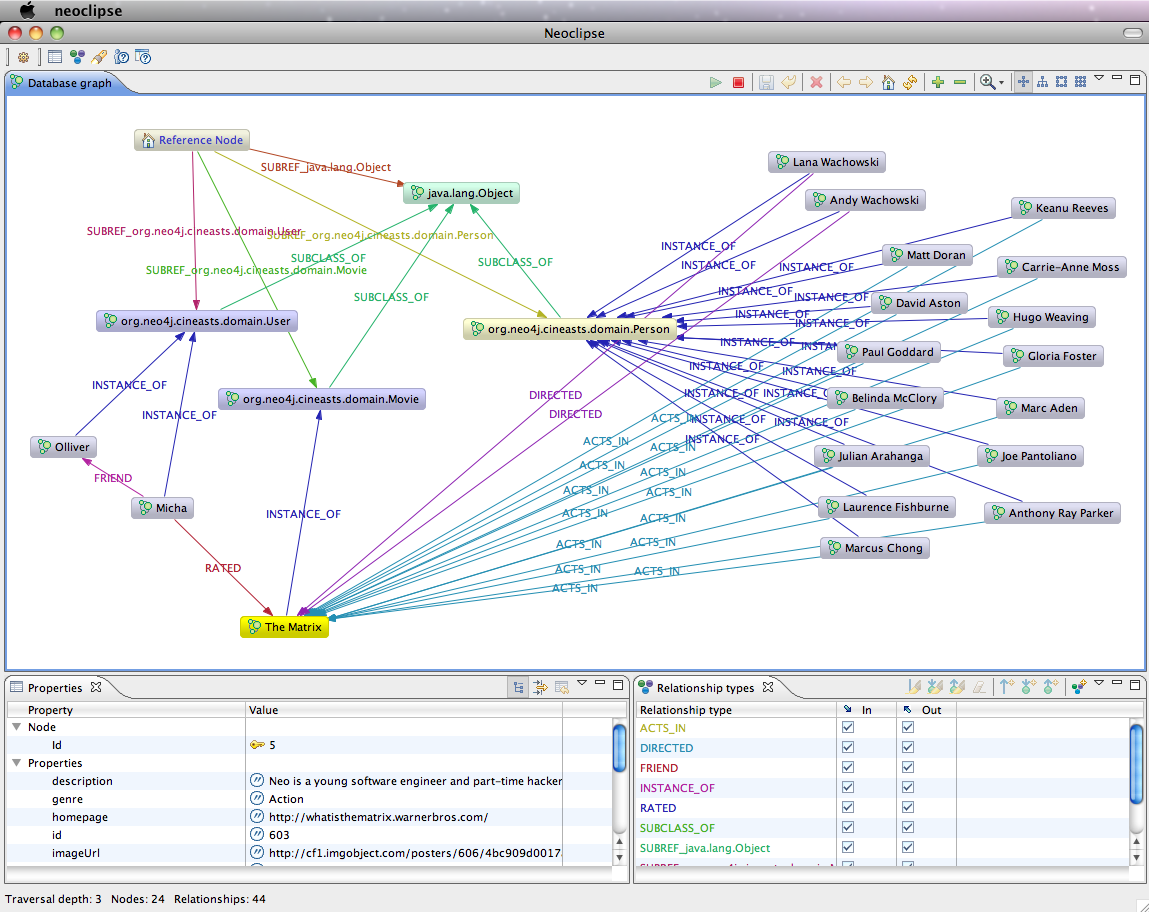 Besides our movies and actors connected by ACTS_IN relationships there were some other nodes. The reference node which is an automatically provided "root node" in Neo4j and can be used to anchor subgraphs for easier access. And Spring Data Graph also represented the type hierarchy of my entities in the graph. Obviously for some internal housekeeping and type checking.