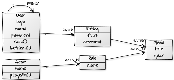 class Movie { String id; String title; int year; Set<Role> cast; } class Actor { String id; String name; Set<Movie> filmography; Role playedIn(Movie movie, String role) { ... } } class Role { Movie movie; Actor actor; String role; } class User { String login; String name; String password; Set<Rating> ratings; Set<User> friends; Rating rate(Movie movie, int stars, String comment) { ... } void befriend(User user) { ... } } class Rating { User user; Movie movie; int stars; String comment; }