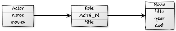 @NodeEntity class Movie { @Indexed(unique=true) String id; String title; int year; @RelatedTo(type = "ACTS_IN", direction = Direction.INCOMING) Set<Actor> cast; } @NodeEntity class Actor { @Indexed(unique=true) int id; String name; @RelatedTo(type = "ACTS_IN") Set<Movie> movies; public Role playedIn(Movie movie, String roleName) { return new Role(this,movie, roleName); } }