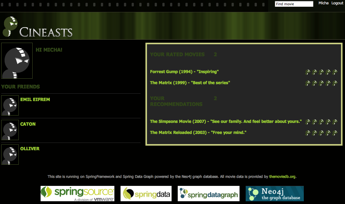 Any logged-in user was now available in the session, and could be used for all the social interactions. The remaining work for this was mainly adding controller methods and JSPs for the views. We used the helper method getUserFromSession() in the controllers to access the logged-in user and put it in the model for rendering. Here's what the UI had evolved to: