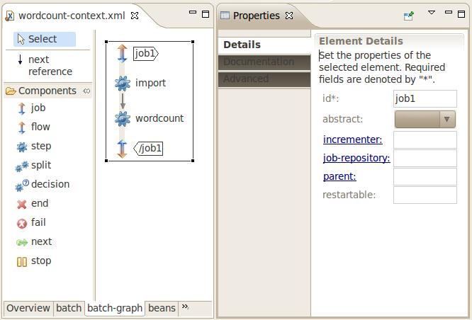 <batch:job id="job1"> <batch:step id="import" next="wordcount"> <batch:tasklet ref="script-tasklet"/> </batch:step> <batch:step id="wordcount"> <batch:tasklet ref="wordcount-tasklet" /> </batch:step> </batch:job>