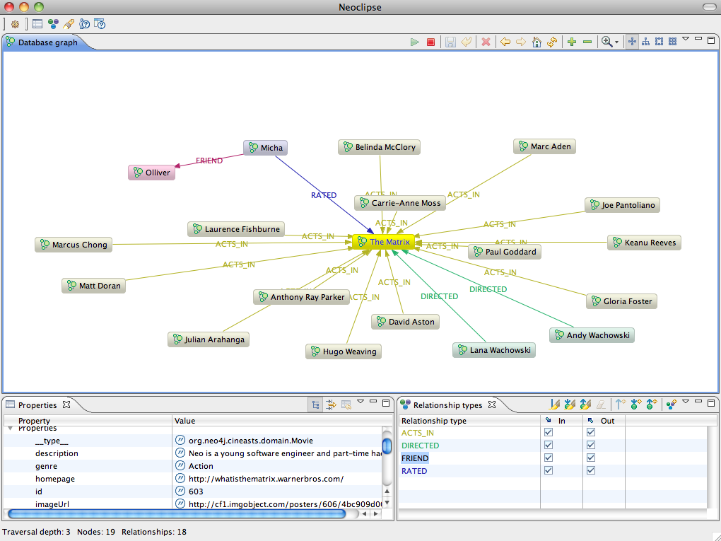 enum RelationshipTypes implements RelationshipType { ACTS_IN }; GraphDatabaseService gds = new EmbeddedGraphDatabase("/path/to/store"); Node forrest=gds.createNode(); forrest.setProperty("title","Forrest Gump"); forrest.setProperty("year",1994); gds.index().forNodes("movies").add(forrest,"id",1); Node tom=gds.createNode(); tom.setProperty("name","Tom Hanks"); Relationship role=tom.createRelationshipTo(forrest,ACTS_IN); role.setProperty("role","Forrest"); Node movie=gds.index().forNodes("movies").get("id",1).getSingle(); assertEquals("Forrest Gump", movie.getProperty("title")); for (Relationship role : movie.getRelationships(ACTS_IN,INCOMING)) { Node actor=role.getOtherNode(movie); assertEquals("Tom Hanks", actor.getProperty("name")); assertEquals("Forrest", role.getProperty("role")); }