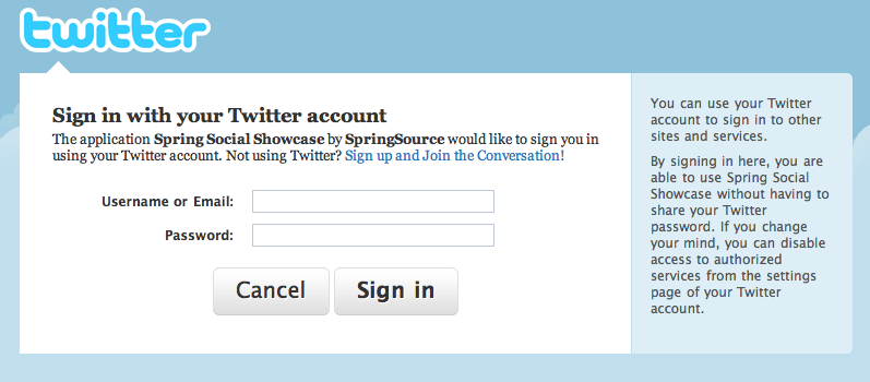 Clicking this button will trigger a POST request to "/signin/twitter", kicking off the Twitter sign in flow. If the user has not yet signed into Twitter, the user will be presented with the following page from Twitter: