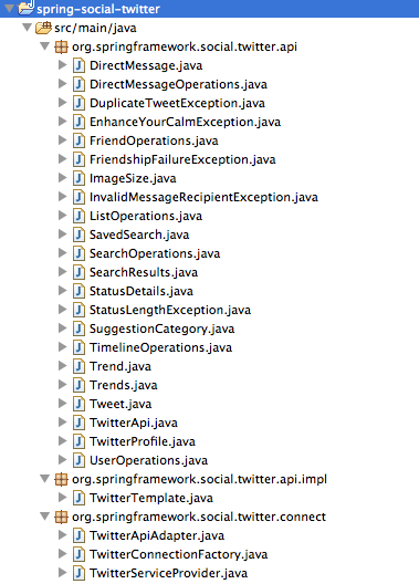 Here, the central service API type, Twitter, is located in the api package along with its supporting operations types and data transfer object types. The primary implementation of that interface, TwitterTemplate, is located in the api.impl package (along with other package-private impl types have that been excluded from this view). Finally, the connect package contains the implementations of various connect SPIs that enable connections to Twitter to be established and persisted.
