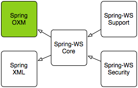 The following figure illustrates the Spring-WS modules and the dependencies between them. Arrows indicate dependencies, i.e. Spring-WS Core depends on Spring-XML and the OXM module found in Spring 3 and higher.